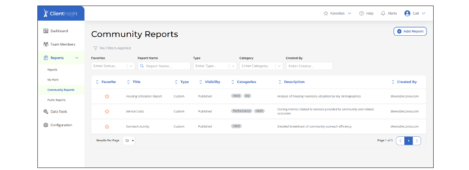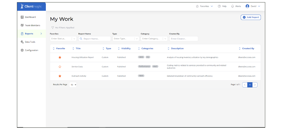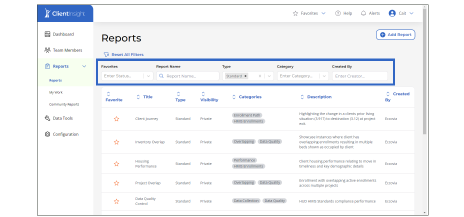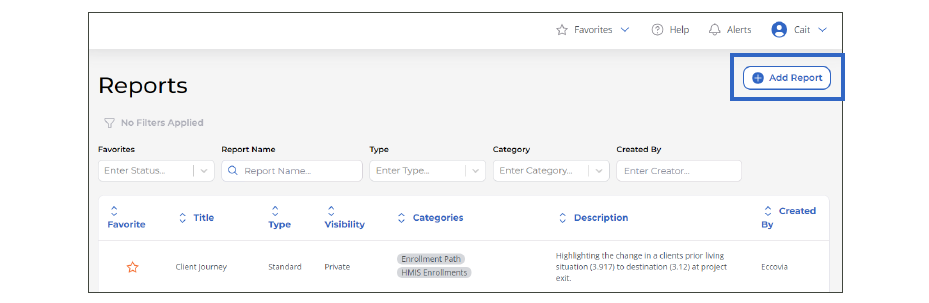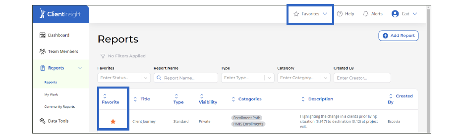 Selecting any report from the Reports page or Favorites list will navigate directly